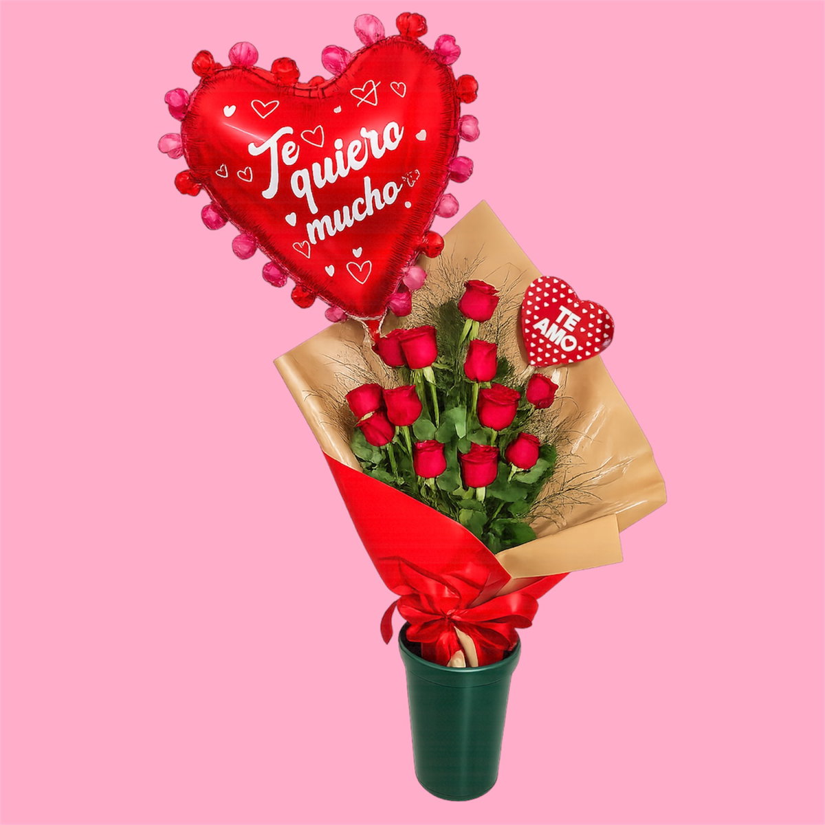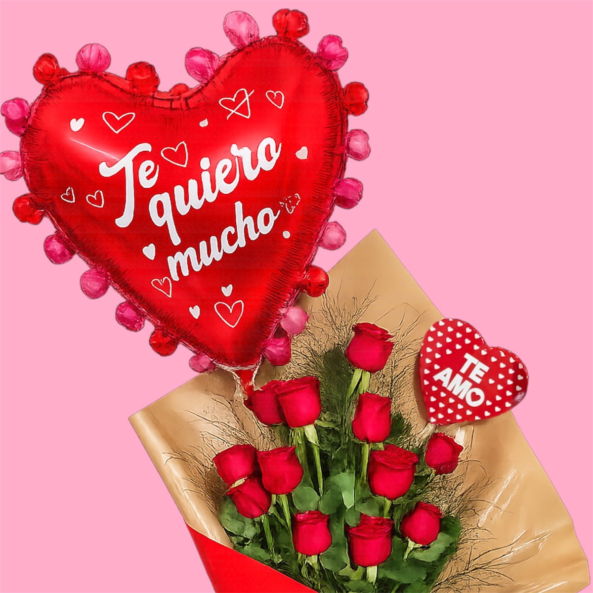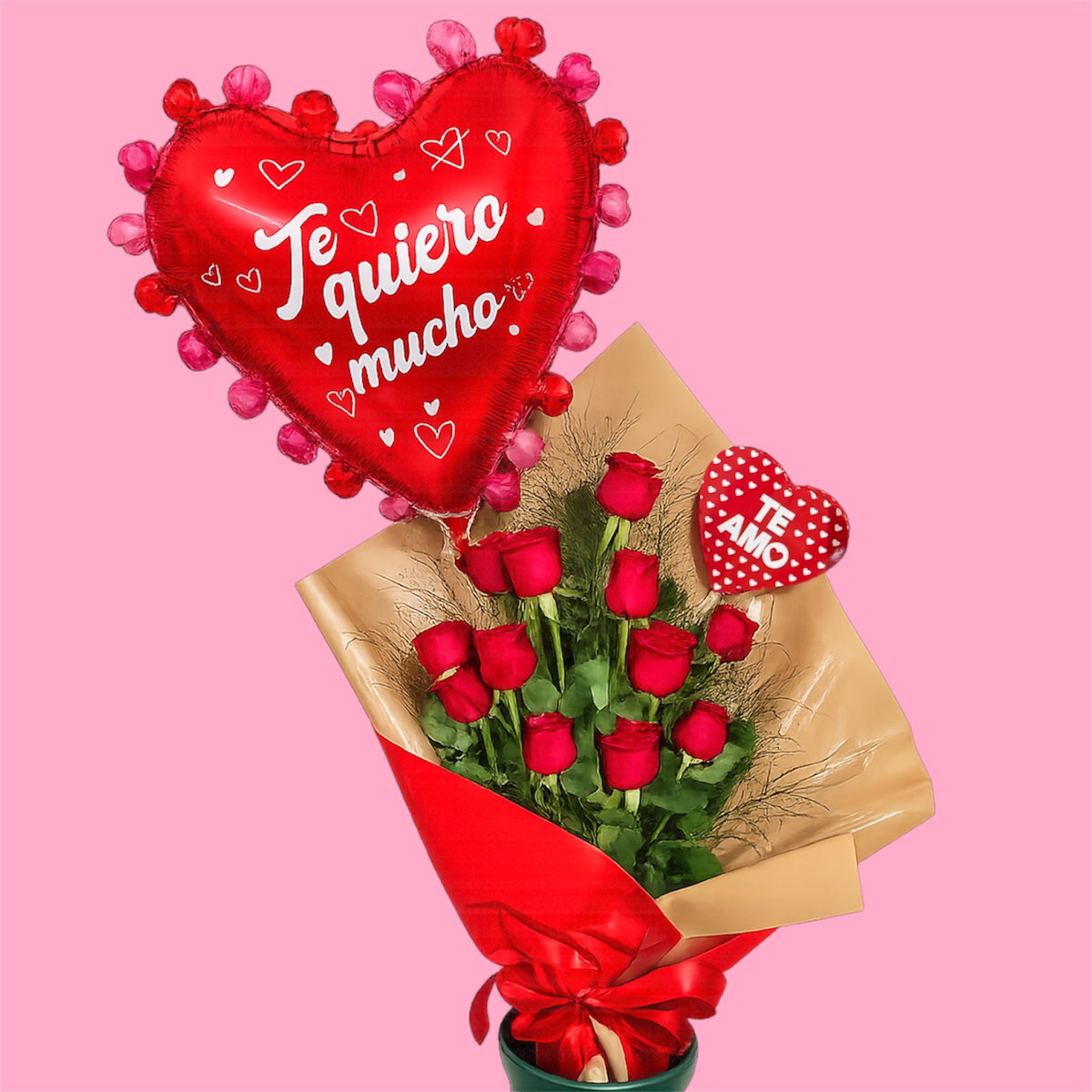 Un combo puramente rojo, una docena de rosas rojas preparadas con verdes y envueltas en papel kraft y de color, sumadas con un globo grande metalizado en forma de corazón y un cartel en vara con una frase. Una declaración de amor elegante, vibrante y lista para sorprender. ❤️