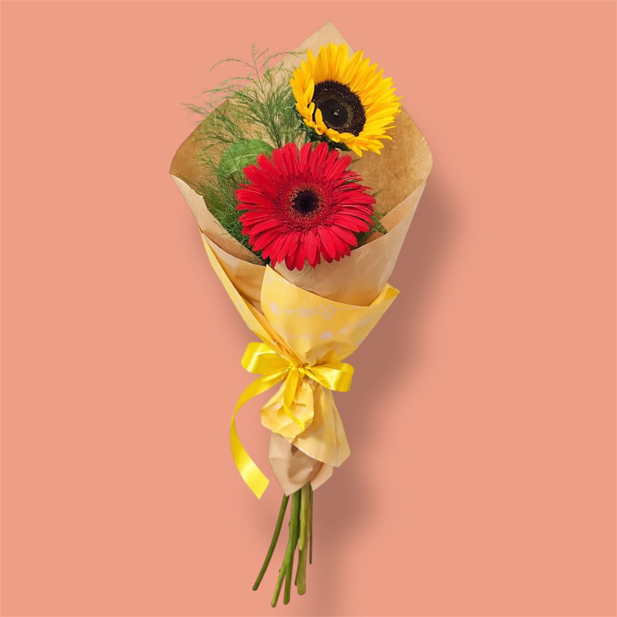 Ramo fresco y vibrante compuesto por un girasol radiante y una gerbera roja intensa, acompañados de delicado follaje y envueltos en papel kraft con lazo amarillo.