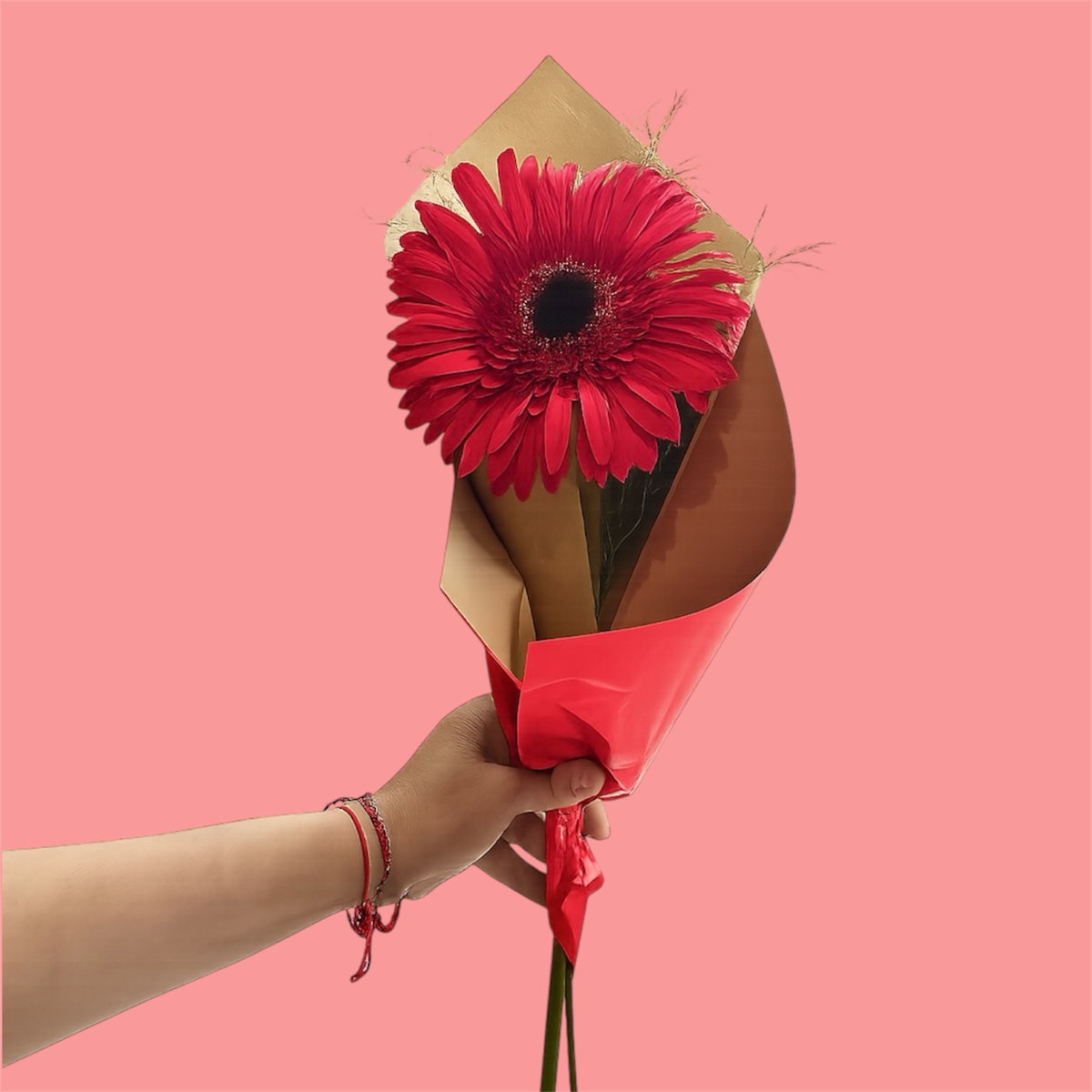Ramo individual compuesto de gerbera preparado con verdes y envoltorio de papel kraft y papel de color a juego con la flor. Perfecto como detalle sutil y elegante.