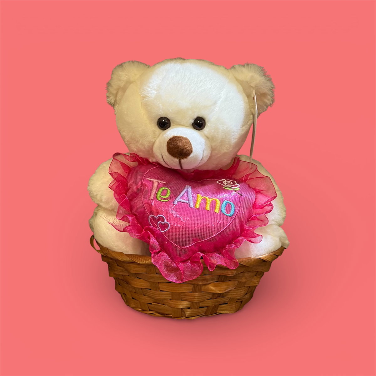 Peluche de oso blanco tamaño pequeño con un corazón rosa-con las palabras "Te amo" en diferente color cada letra. Perfecto para sumar junto a tu ramo. No viene con cesto incluído