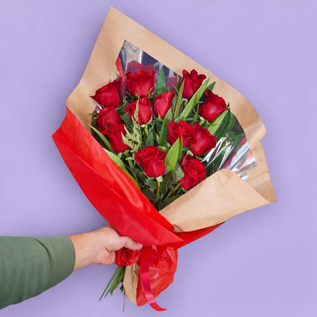 Gran ramo de 12 rosas rojas preparadas y envueltas con papel madera y un papel de color a elección (consultar disponibilidad). Una presentación elegante y cálida, lista para regalar y expresar sentimientos desde el primer momento.
