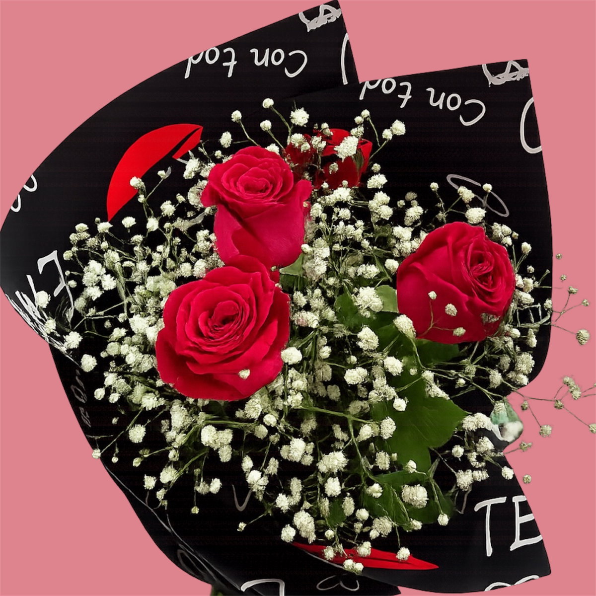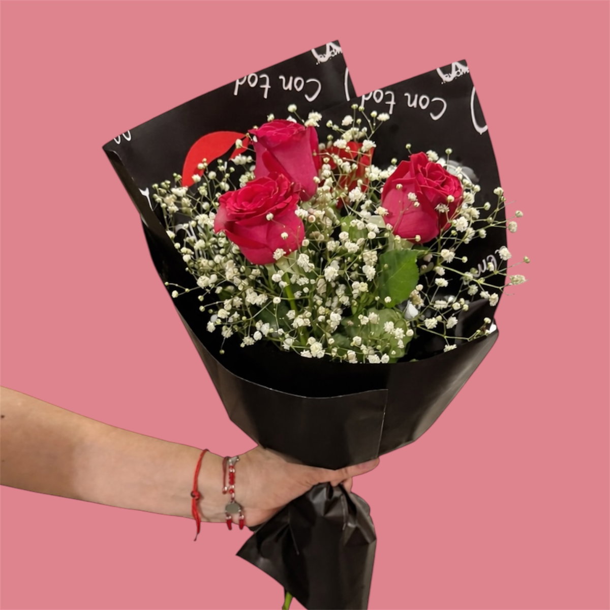 Pequeño ramo de 3 rosas rojas preparadas y envueltas con papel madera y un papel de color a elección (consultar disponibilidad). Una presentación elegante y cálida, lista para regalar y expresar sentimientos desde el primer momento.