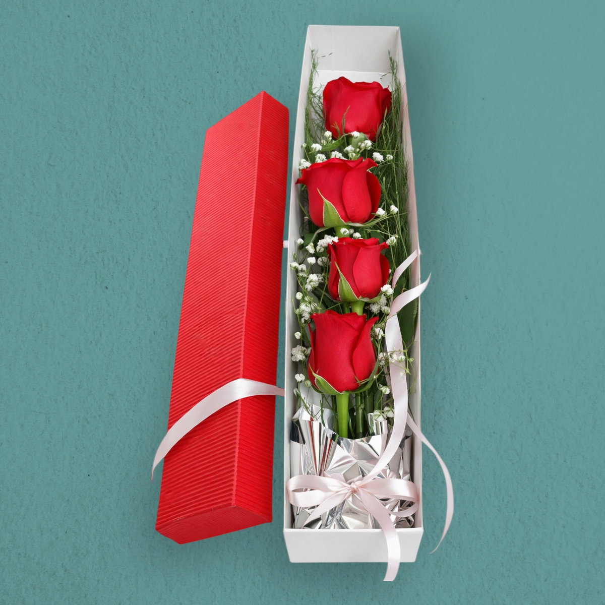 Arreglo de cuatro rosas rojas preparadas con gipsofila presentadas en una caja de regalo. Un regalo delicado que encuentra su fuerza en la simpleza de tres rosas.