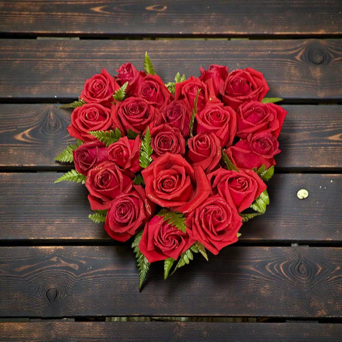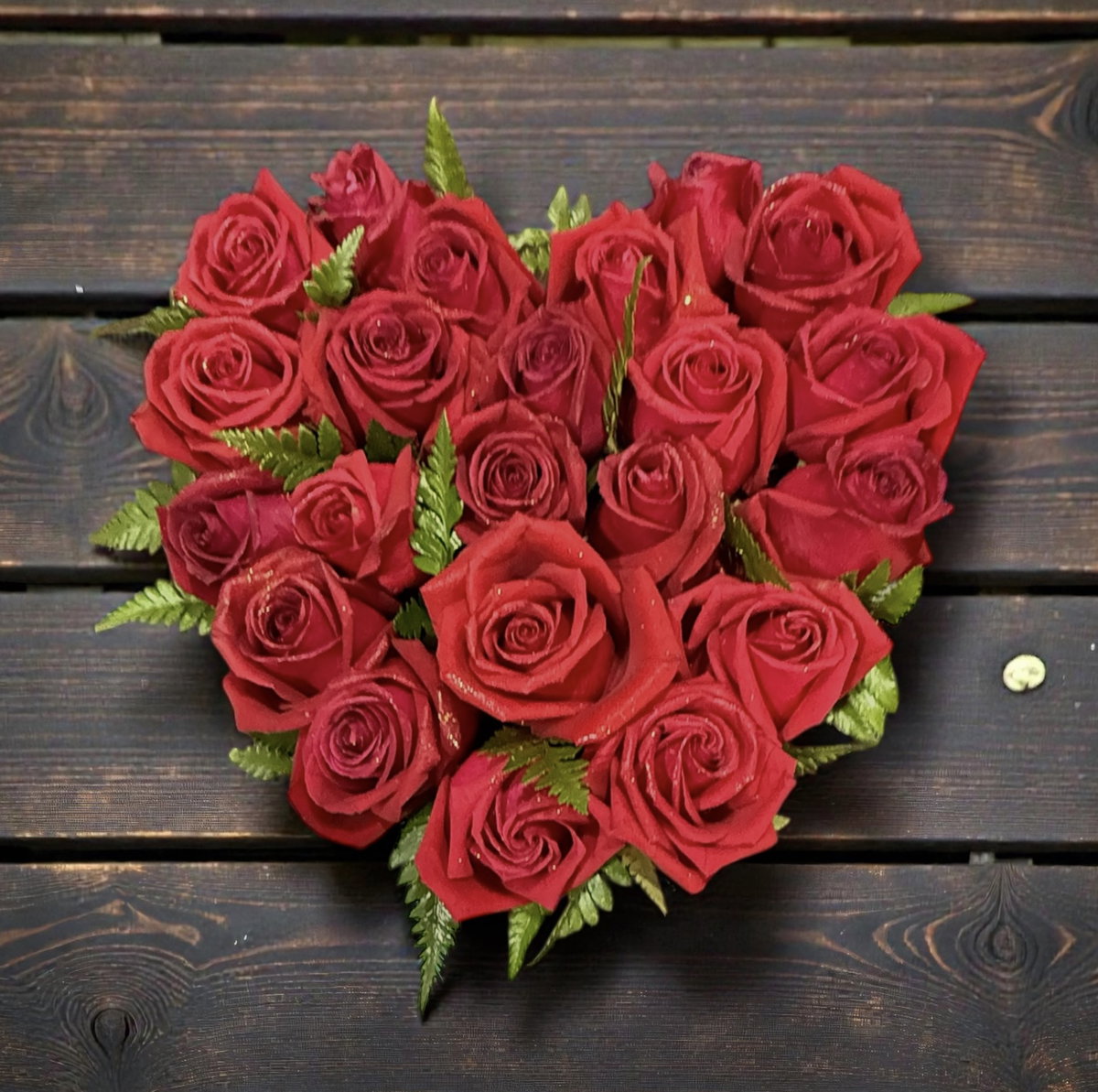 Arreglo floral en forma de corazón compuesto por rosas rojas frescas, cuidadosamente seleccionadas y acompañadas por delicado follaje verde. Un diseño romántico, elegante y fuera de lo normal que simboliza el amor profundo, la pasión y los sentimientos sinceros. Ideal para sorprender en aniversarios, San Valentín o para decir “te amo” sin palabras. Listo para regalar y enamorar desde el primer vistazo. 🌹❤️