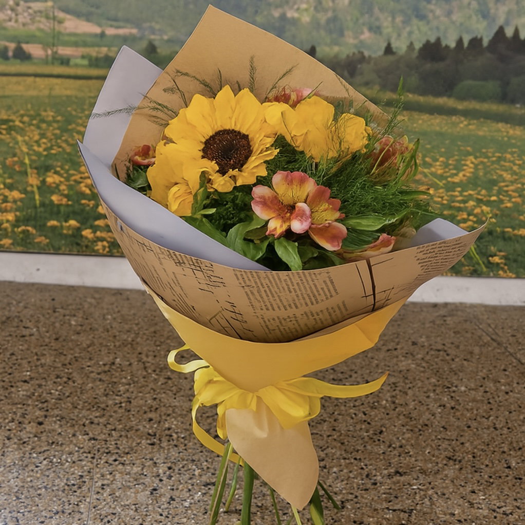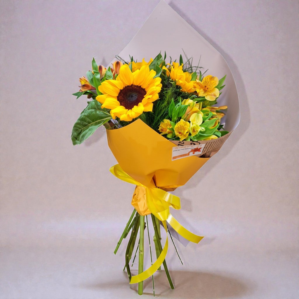 Ramo con girasol y astromelias amarillas, acompañado de follaje verde y envuelto en papel decorativo amarillo con lazo a tono. Un arreglo alegre y luminoso, ideal para regalar felicidad, sorprender y llenar de color cualquier espacio. Perfecto para cumpleaños, agradecimientos o para alegrar el día. 💌