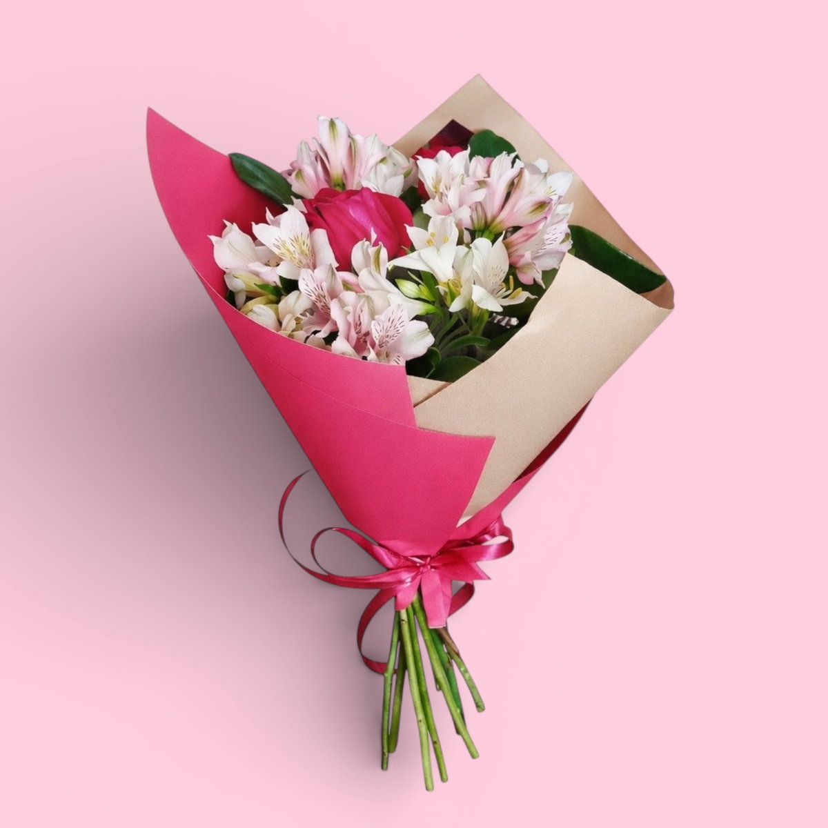 Ramo de astromelias rosadas y blancas con una rosa central, envuelto en papel kraft y rosa, con lazo a tono. Fresco, delicado y listo para regalar. Ideal para un detalle simple y elegante. 🌹🌸