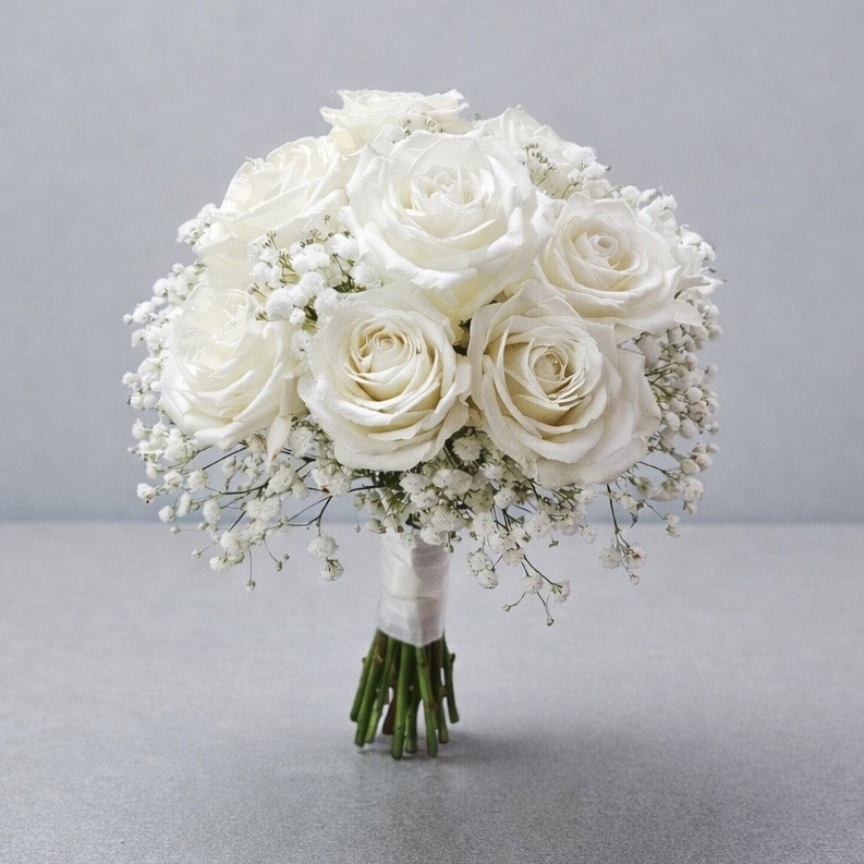 Ramo de novia compuesto por rosas blancas cuidadosamente seleccionadas, acompañadas de gypsophila que aporta textura y delicadeza. Su diseño clásico y armonioso transmite pureza, elegancia y romanticismo, ideal para ceremonias íntimas o estilos nupciales atemporales.