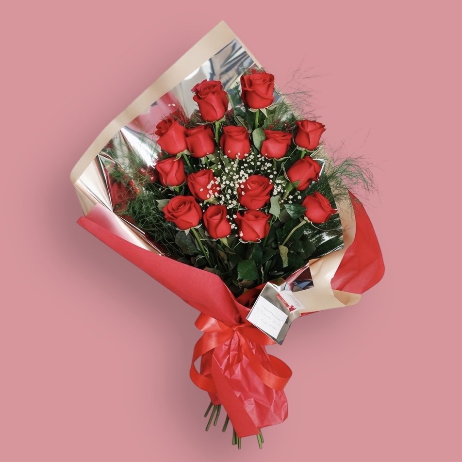 Ramo de 15 rosas rojas, ideal para quinceañeras. Un arreglo elegante y llamativo, con detalles de follaje y terminación prolija, pensado para celebrar este momento único con flores que simbolizan amor y alegría. Perfecto para regalar y sorprender. 🌹👑
