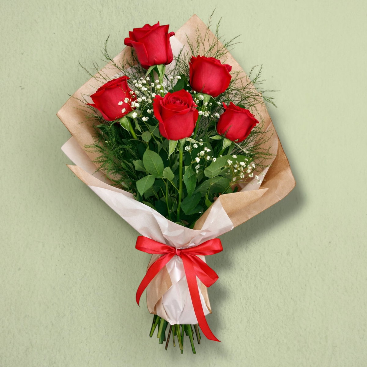 Ramo de cinco rosas rojas frescas con follaje natural, envuelto en papel kraft de textura orgánica y lazo delicado. Un clásico elegante, ideal para regalar. 🌹