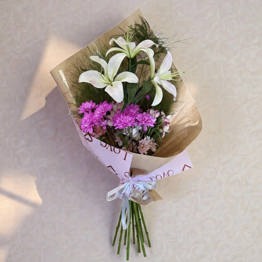 Ramo alargado y estilizado compuesto por lilium blancos y flores San Vicente en tonos rosados, acompañado de follaje fino. Envuelto en papel kraft de acabado natural y lazo delicado. Ideal para regalar en ocasiones especiales o como gesto elegante.