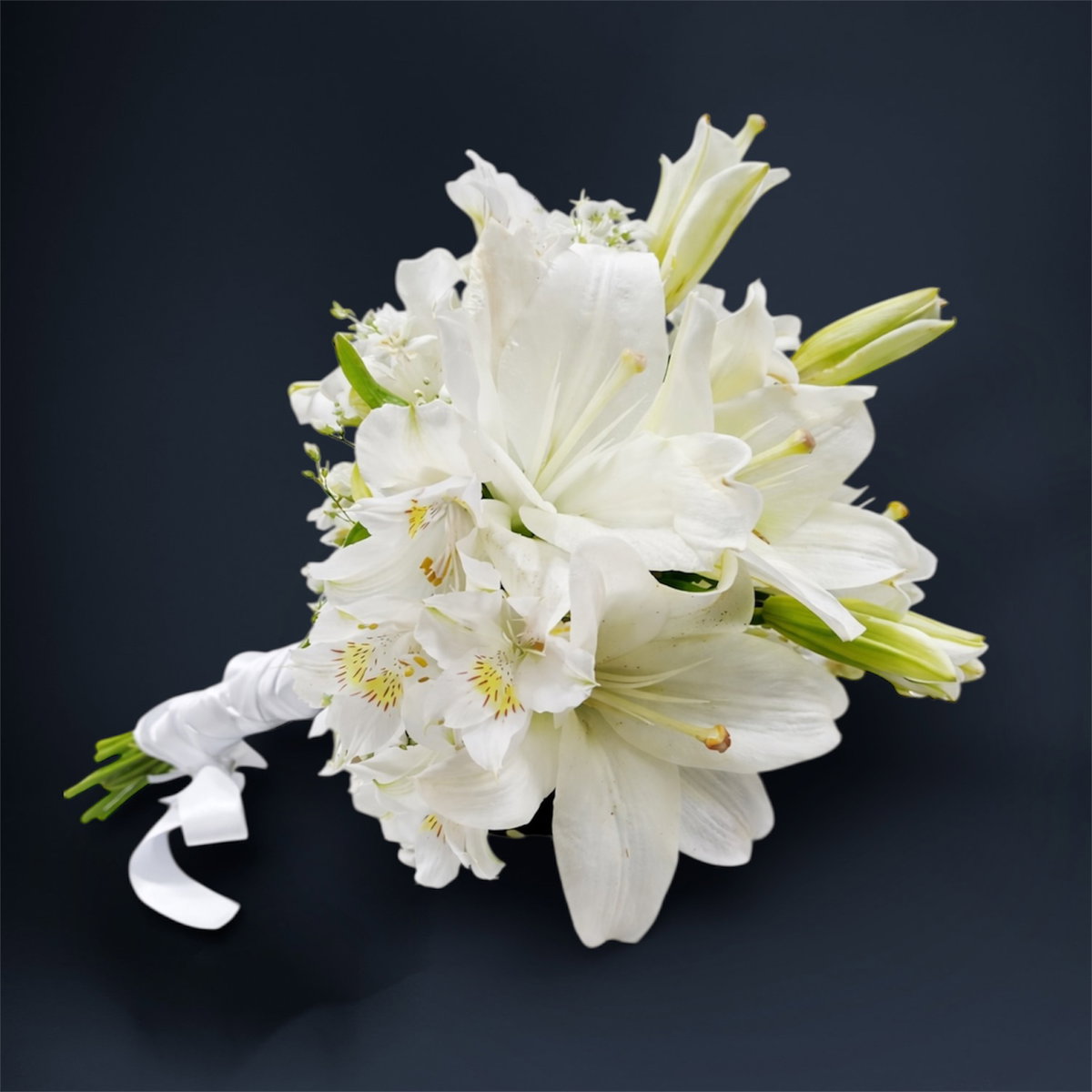 Ramo Ramo de novia confeccionado con liliums blancos y alstroemerias, de aspecto natural y delicado. Diseño clásico y luminoso, ideal para ceremonias y momentos especiales. 🤍