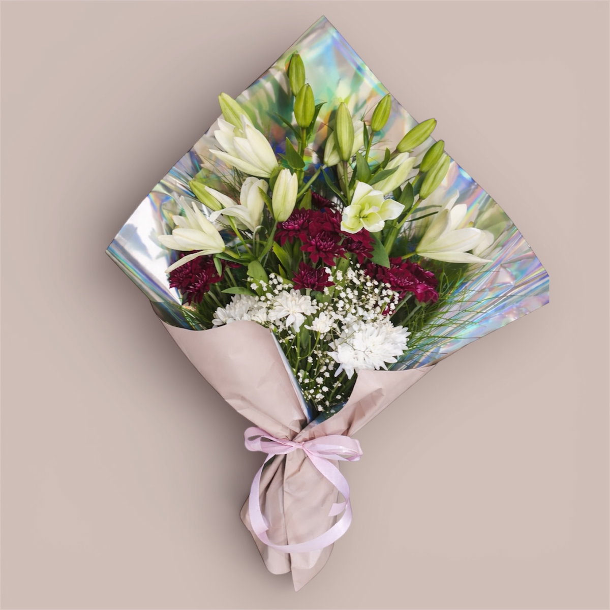 Ramo compuesto por lilium blancos, flores San Vicente y gipsofilas lilas.Una combinación equilibrada de colores suaves y contrastes profundos que aporta elegancia, frescura y un estilo delicado. Ideal para regalos especiales, aniversarios o detalles con significado. Presentación cuidada y armónica, lista para entregar.