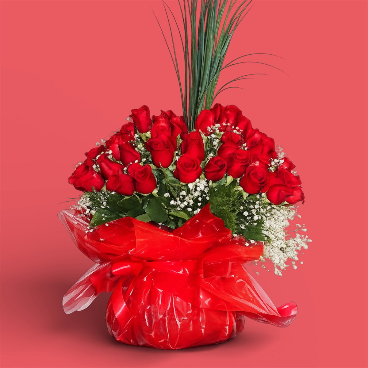 Impactante y elegante ramo de 36 rosas frescas, presentado en base de agua para mayor duración. Puede elegirse armado en oasis o en florero, ideal para regalar en ocasiones únicas y transmitir amor.