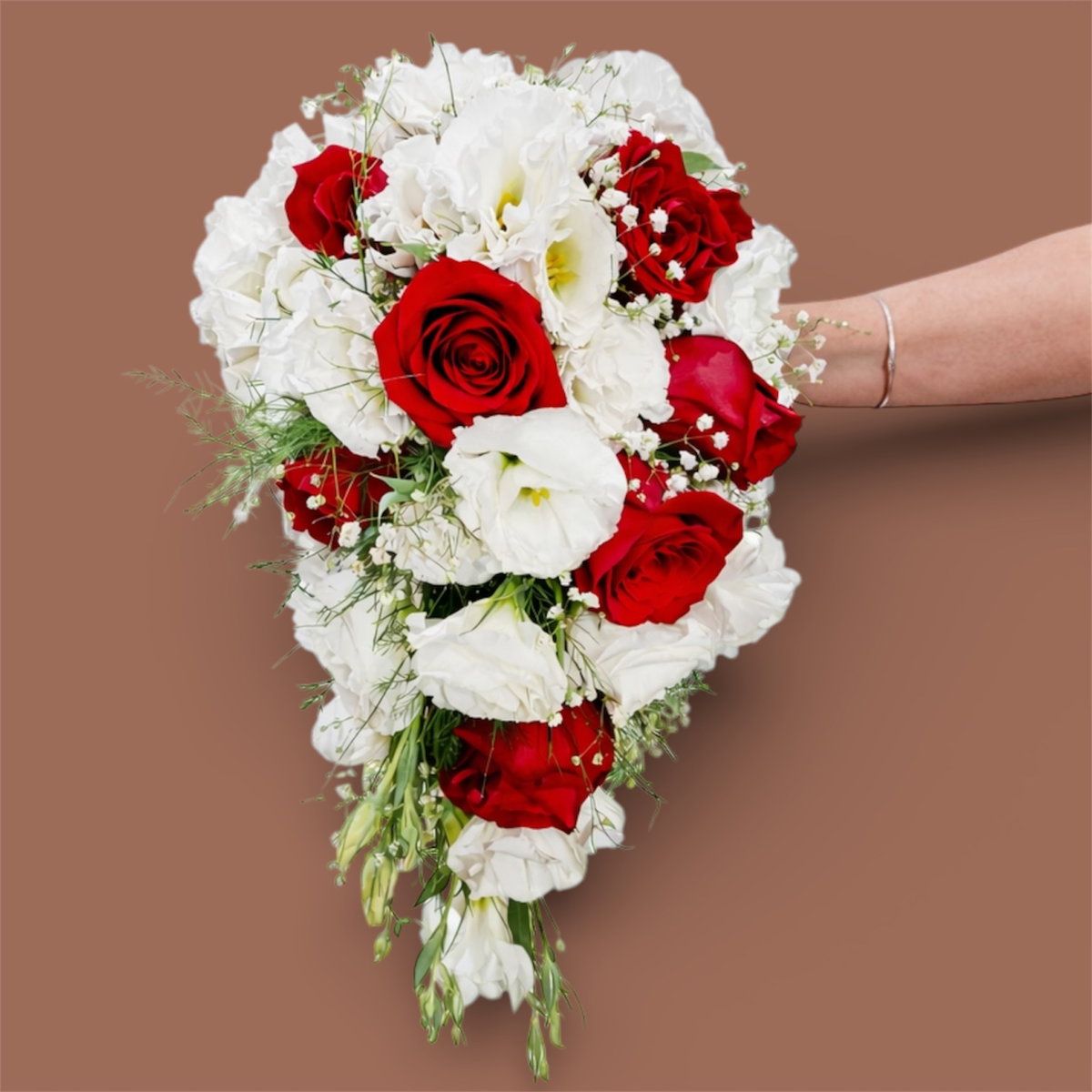Ramo de novia en formato cascada, elaborado con claveles blancos, rosas rojas y delicados follajes. Su caída natural y combinación de colores crean un diseño elegante, clásico y romántico, ideal para acompañar el vestido y destacar en la ceremonia con presencia y sofisticación floral.