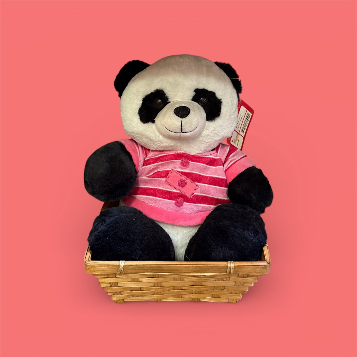 Peluche de oso panda tamaño medio-chico con una remera abotonada de rayas rosas. Hermoso detalle