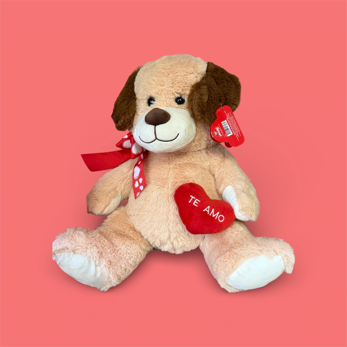 Peluche de perrito color claro con orejas marrones, un lazo en el cuello y un corazón rojo que dice "te amo". Tamaño grande